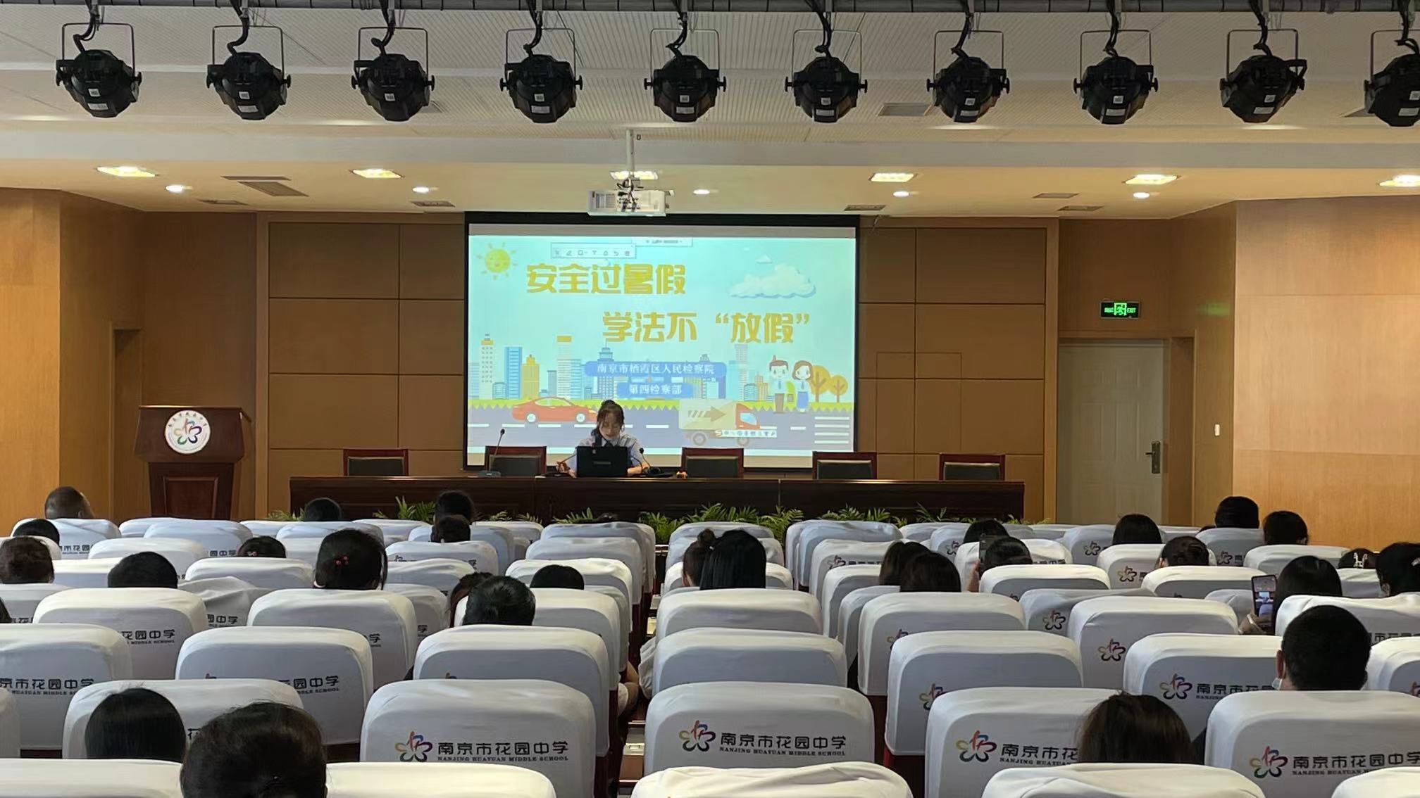 学生们即将放暑假,溺水、交通、气象自然灾害等安全问题进入易发期,为确保学生度过一个安全、愉快的暑假,2021年6月28日上午,我校开展了“安全过暑假 学法不“放假””为主题的南京市栖霞区人民检察院检察官进校园暑假前安全专题活动。本次活动,学生和家长分别在两个场所进行,家长集中到报告厅,而学生们采取在班级收听直播的形式。